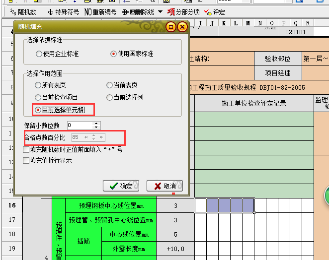 軟件當(dāng)中一般都是測(cè)試10個(gè)點(diǎn)的,只檢測(cè)6個(gè)點(diǎn)的話,可以直接選擇這6個(gè)單元格,然后再點(diǎn)擊隨機(jī)數(shù)填充,(選擇當(dāng)前選擇單元格選項(xiàng))然后在同一個(gè)界面,設(shè)置合格率為85%,如圖