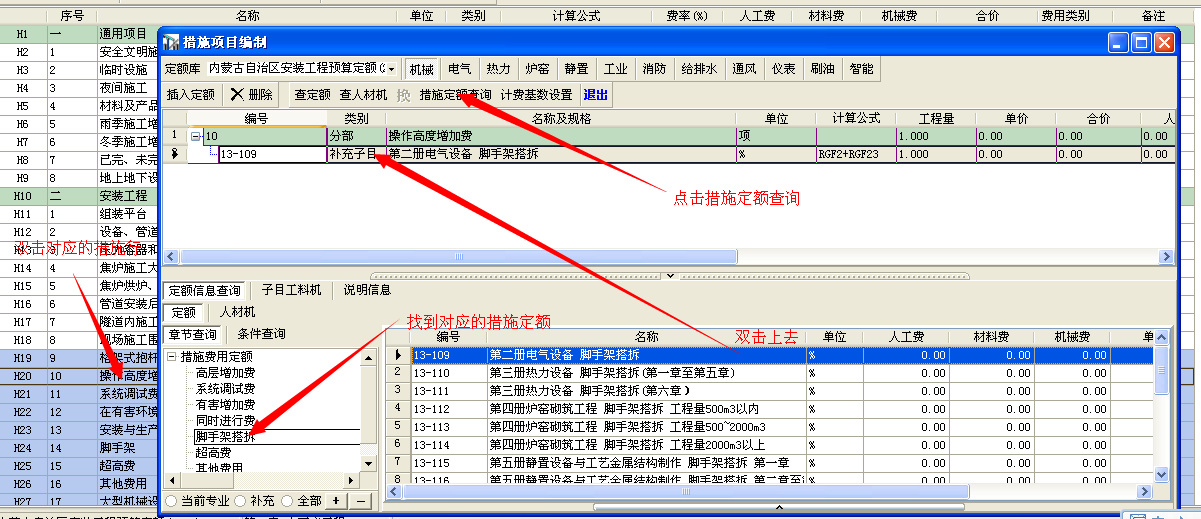 組織措施是自動(dòng)計(jì)算的,技術(shù)措施雙擊對(duì)應(yīng)行,在跳出來(lái)的界面,點(diǎn)擊措施定額查詢,找到相對(duì)應(yīng)的定額子目,雙擊上去,然后關(guān)閉窗口即可
