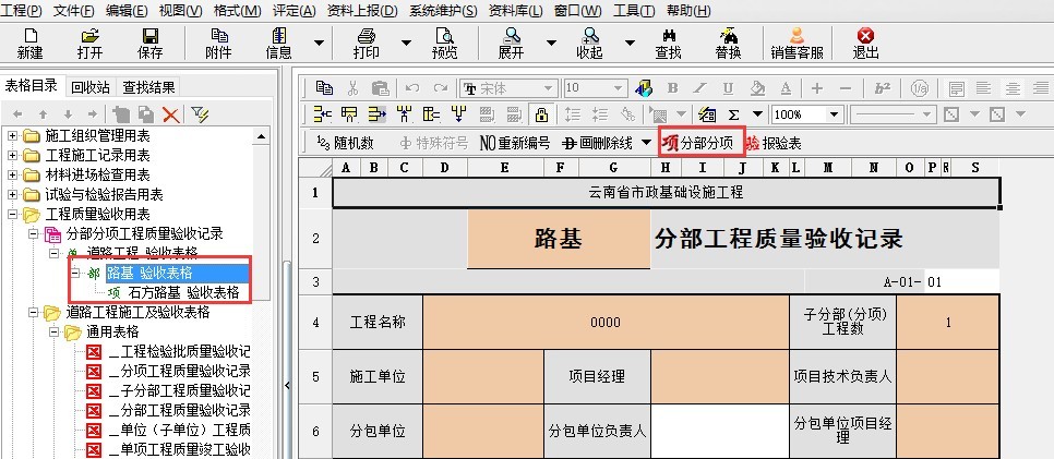 做分部和分項的表格,最簡單的就是用軟件, 在軟件中做好檢驗批表格之,點擊表頭上面的“分不分項”按鈕,即可生成分部分項匯總的表格