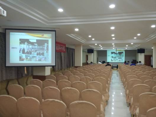 5月22日下午到達(dá)淄博,到達(dá)會(huì)場(chǎng)后安排布置會(huì)場(chǎng)。由于酒店的音響和投影調(diào)試人員沒(méi)有來(lái)到現(xiàn)場(chǎng),晚上6點(diǎn)的來(lái)到時(shí)調(diào)試投影和音響。投影效果在最后的培訓(xùn)人員看不清楚,臨時(shí)和酒店協(xié)調(diào)在會(huì)場(chǎng)中間添加一臺(tái)臨時(shí)的投影儀。安裝調(diào)試好后,晚上8點(diǎn)才去吃飯。